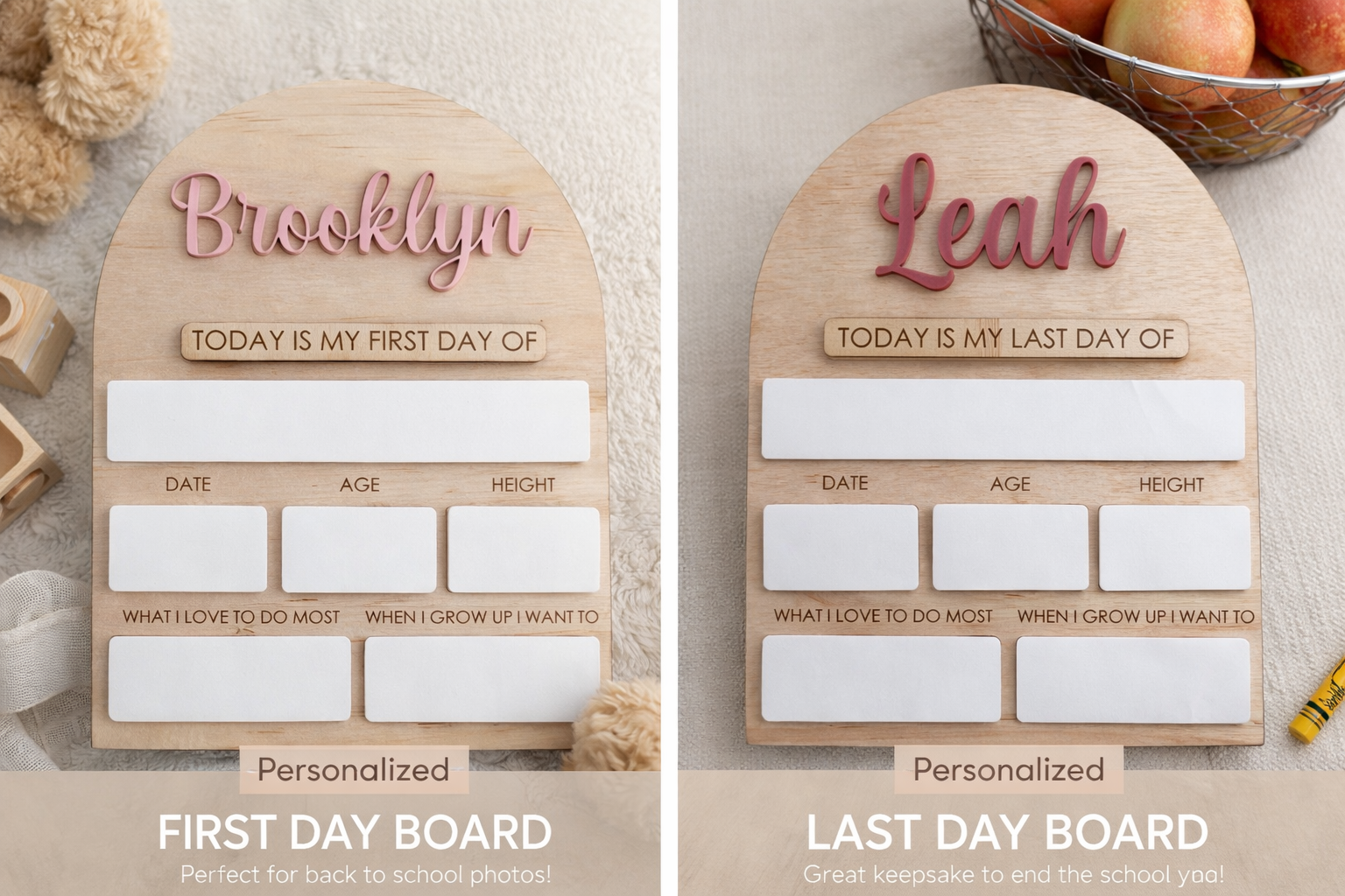 Celebrate the beginning and the end of every school year with our Personalised First & Last Day of School Boards — a timeless keepsake designed to capture how quickly they grow.